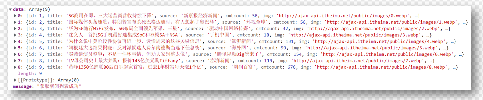 jsaxios({ url: "http://hmajax.itheima.net/api/news", }).then((result) => { console.log(result); });url解释:从黑马服务器使用http协议,访问/api/news路径下的新闻列表资源