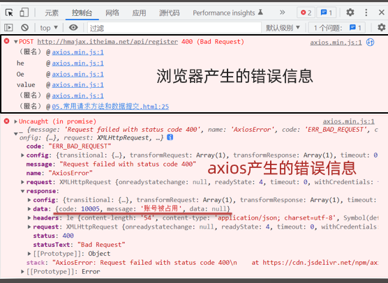js/** * 目标:async和await_错误捕获 */ async function getData() { // 1. try包裹可能产生错误的代码 try { const pObj = await axios({ url: "http://hmajax.itheima.net/api/province" }); const pname = pObj.data.list[0]; const cObj = await axios({ url: "http://hmajax.itheima.net/api/city", params: { pname } }); const cname = cObj.data.list[0]; const aObj = await axios({ url: "http://hmajax.itheima.net/api/area", params: { pname, cname }, }); const areaName = aObj.data.list[0]; document.querySelector(".province").innerHTML = pname; document.querySelector(".city").innerHTML = cname; document.querySelector(".area").innerHTML = areaName; } catch (error) { // 2. 接着调用catch块,接收错误信息 // 如果try里某行代码报错后,try中剩余的代码不会执行了 console.dir(error); } } getData();