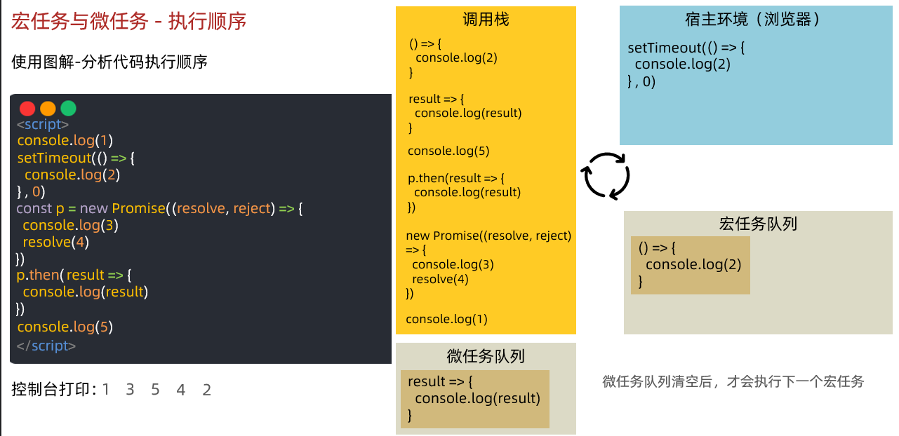 - -执行第一个 script 脚本事件宏任务,里面同步代码 遇到 宏任务/微任务 交给宿主环境,有结果回调函数进入对应队列 当执行栈空闲时,清空微任务队列,再执行下一个宏任务,从1再来